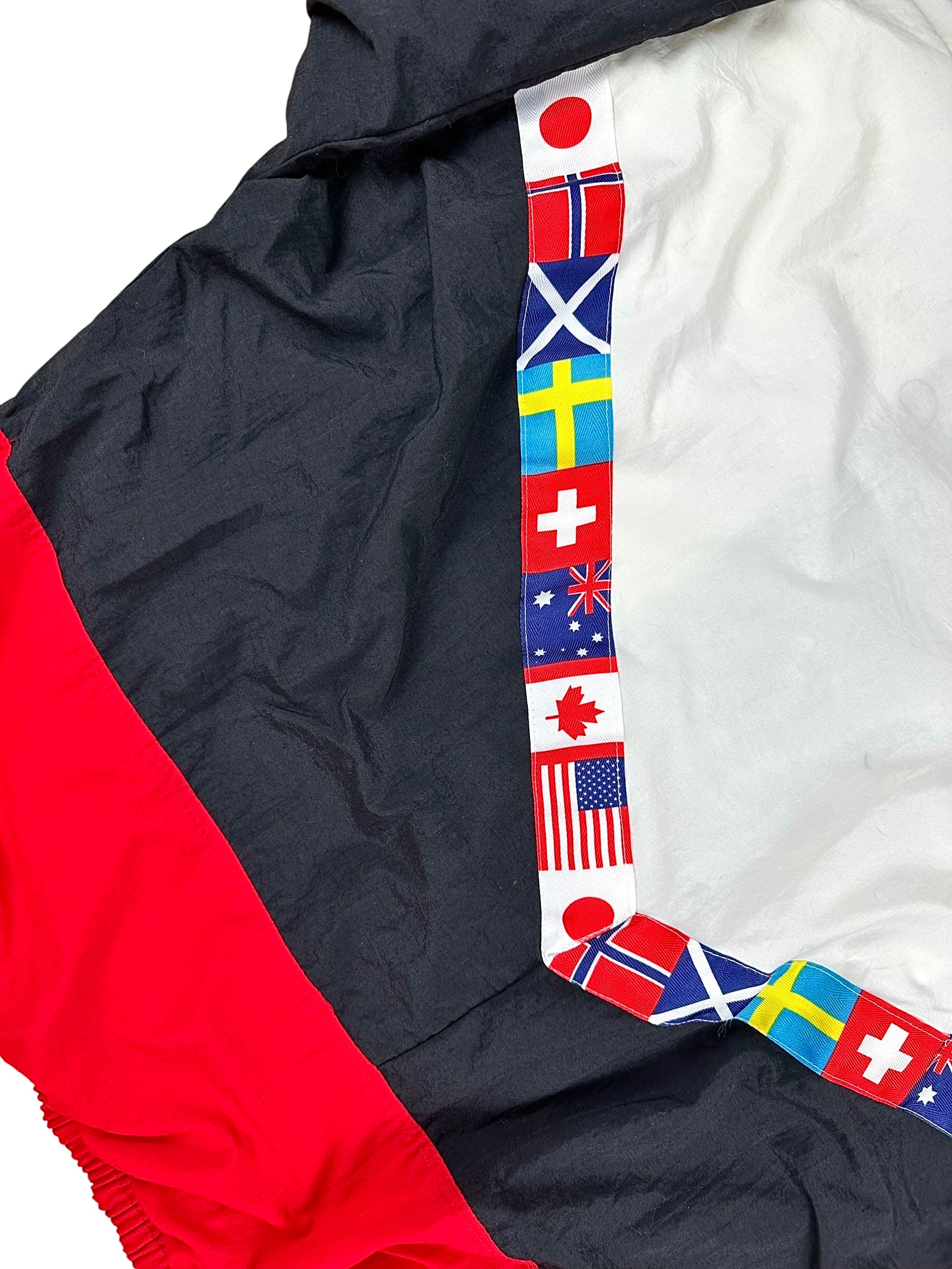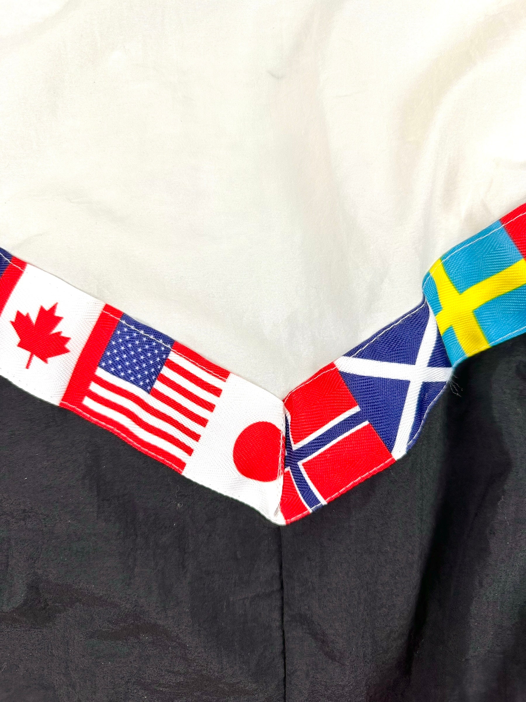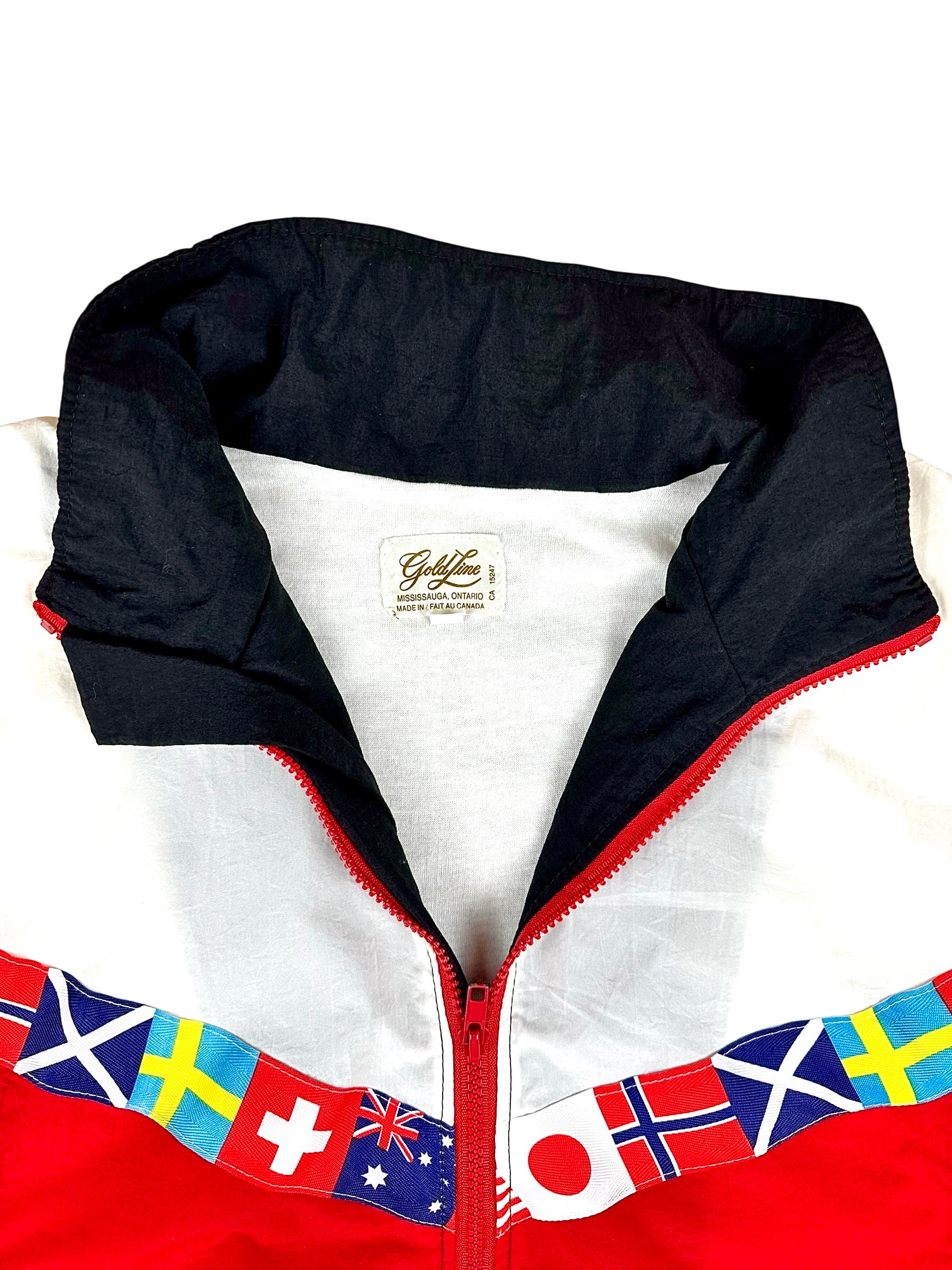 Giacca di tuta vintage firmata Goldline, un pezzo autentico dal design dinamico e internazionale. Realizzata a Mississauga, in Canada, si distingue per l'iconico motivo a bandiere che attraversa il petto e le maniche, conferendo al capo un look distintivo e nostalgico, perfetto per chi ama lo stile sportivo degli anni '80 e '90.