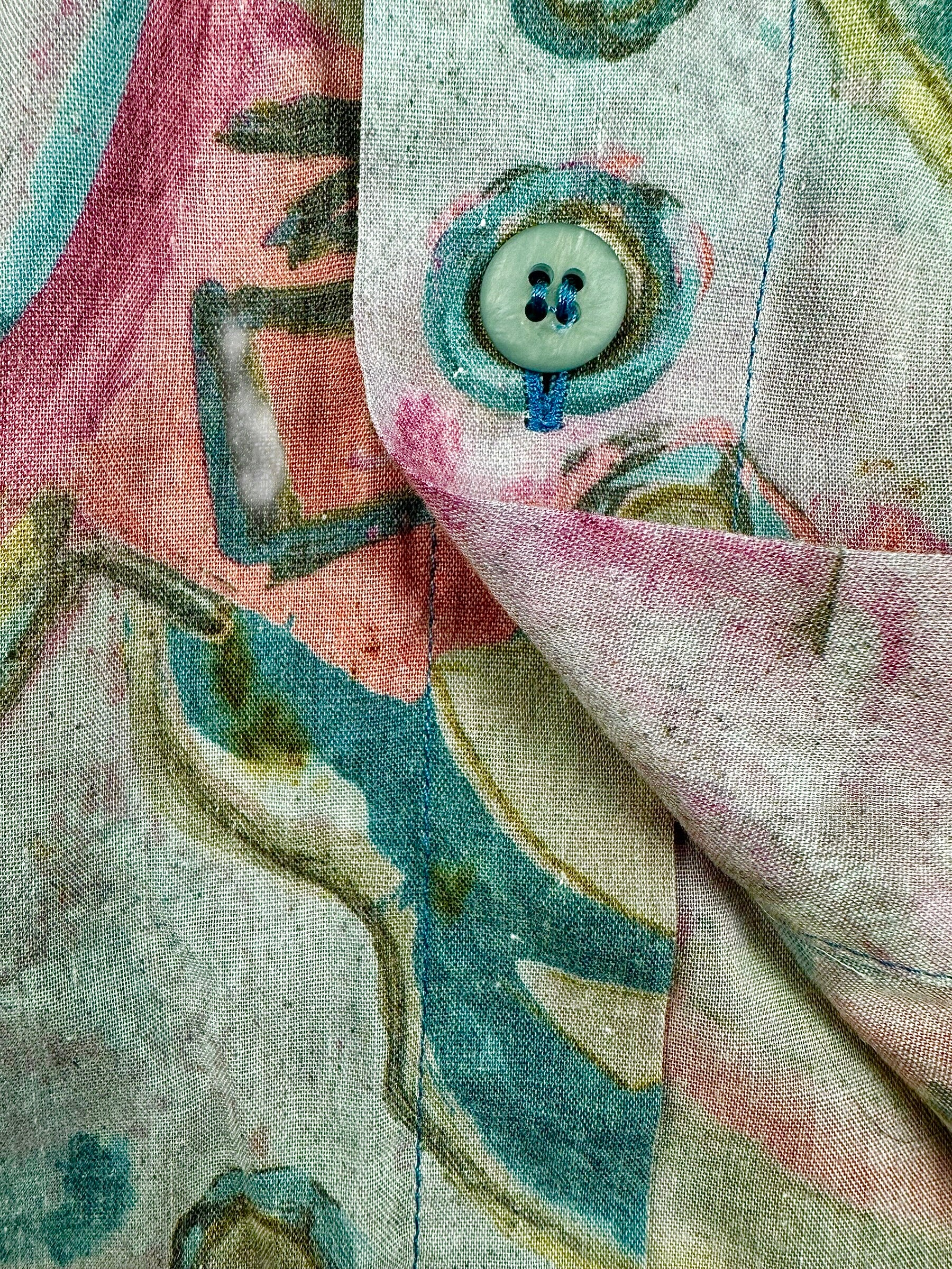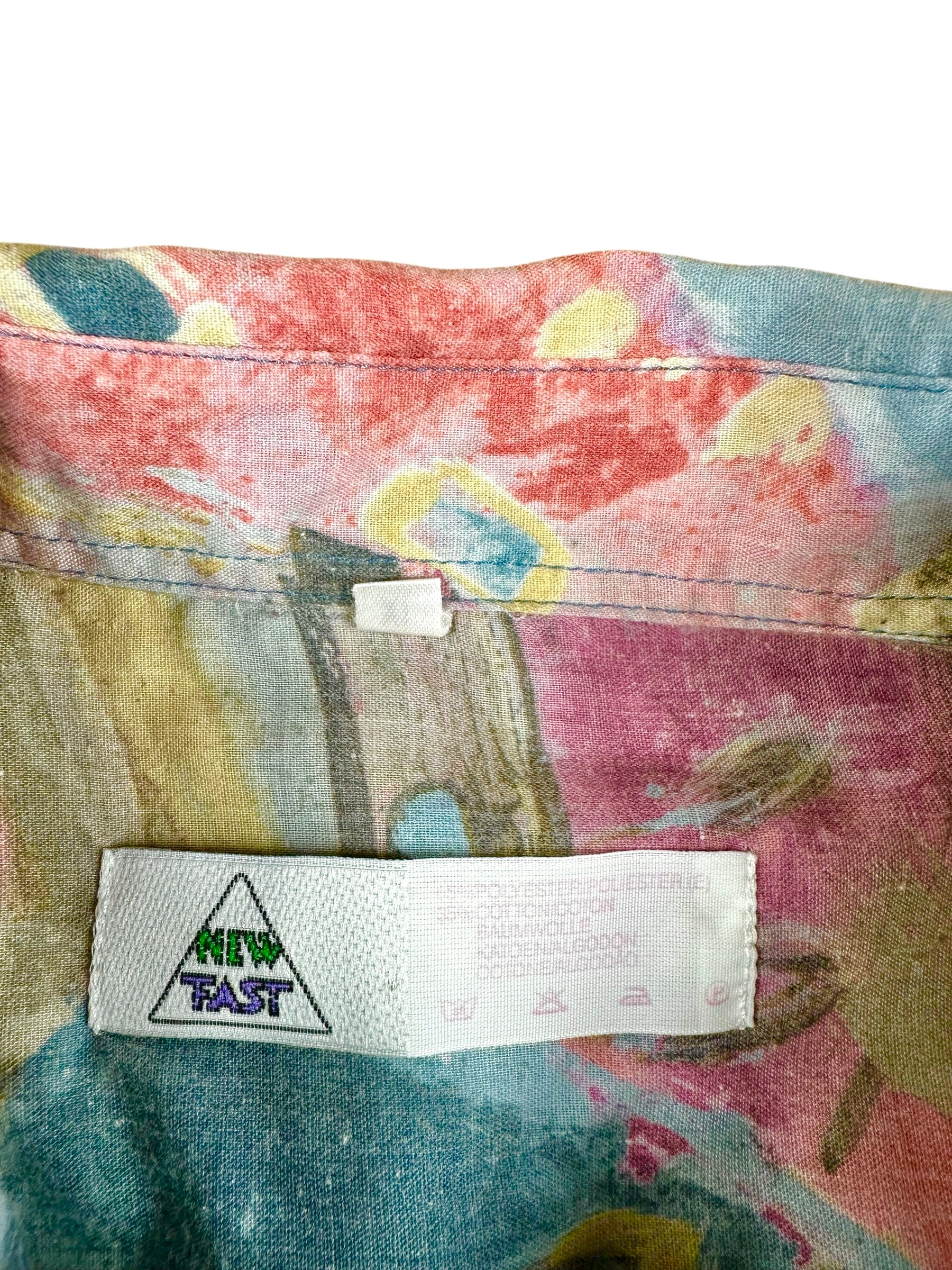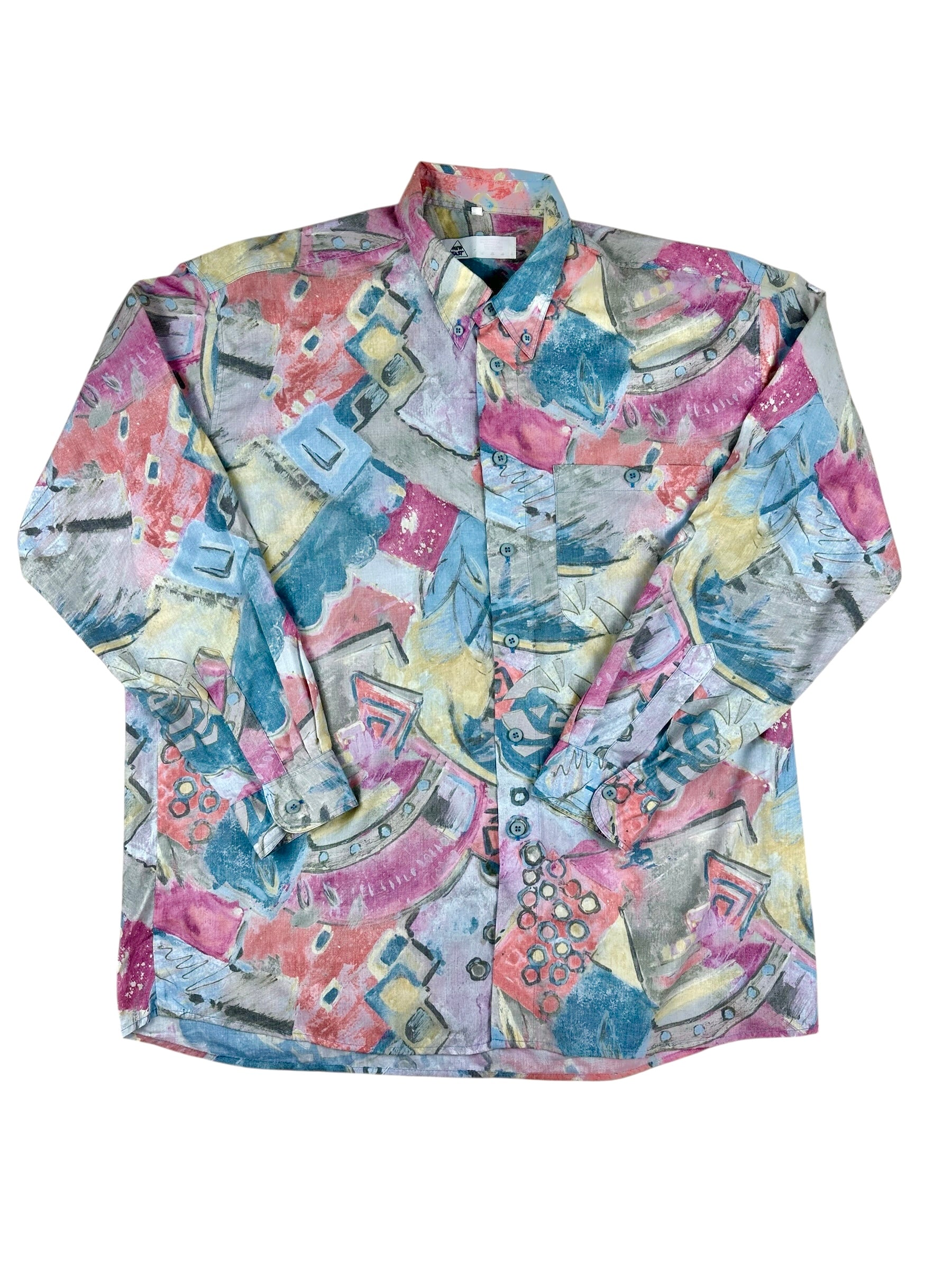 Camicia vintage a maniche lunghe firmata New Fast, un vero manifesto dell'estetica creativa e audace tipica degli anni '80 e '90. Caratterizzata da una stampa astratta e multicolore che ricorda le pennellate dell'arte pittorica, questo capo è perfetto per chi desidera un look vivace, originale e fuori dagli schemi.