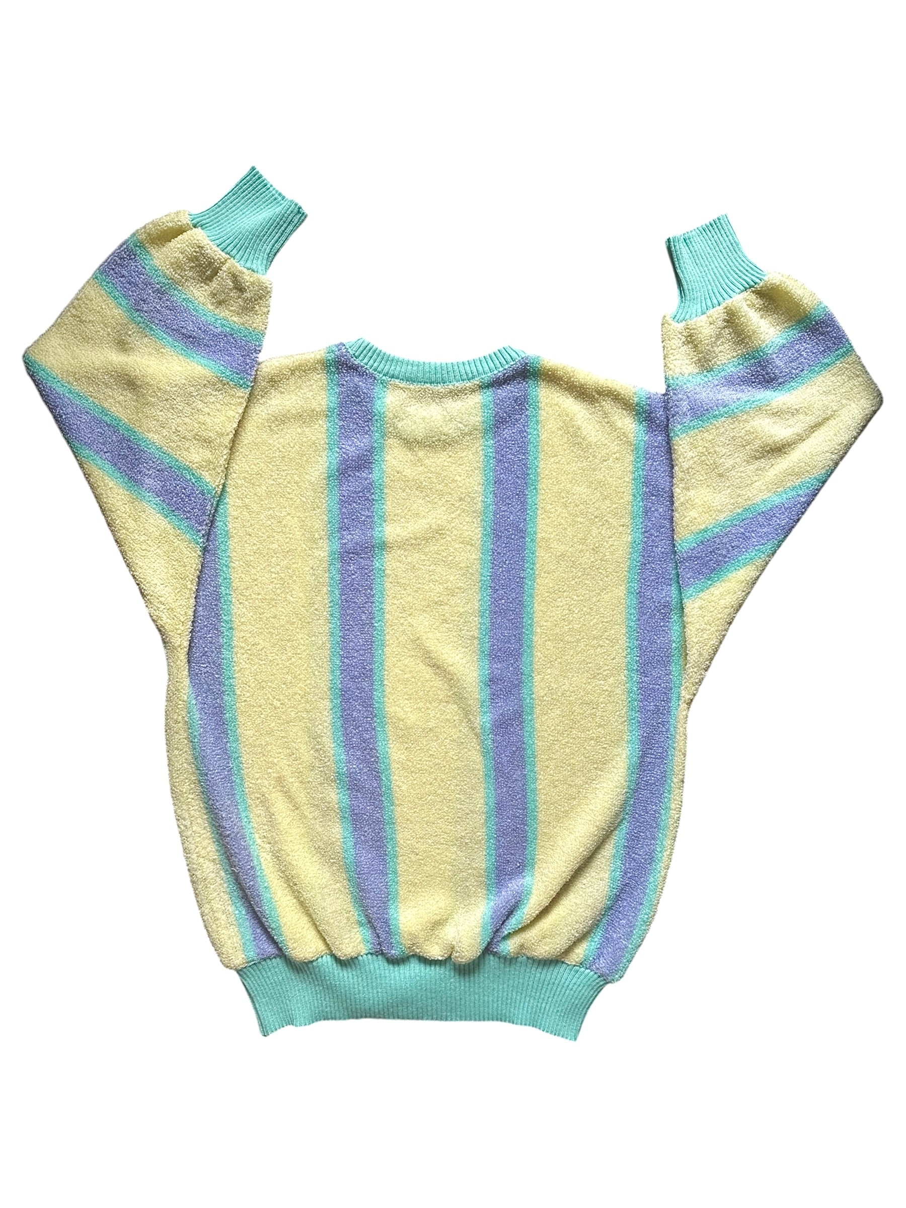 Maglioncino vintage da donna morbido e avvolgente, con righe verticali lilla e verde acqua su base giallo crema.
